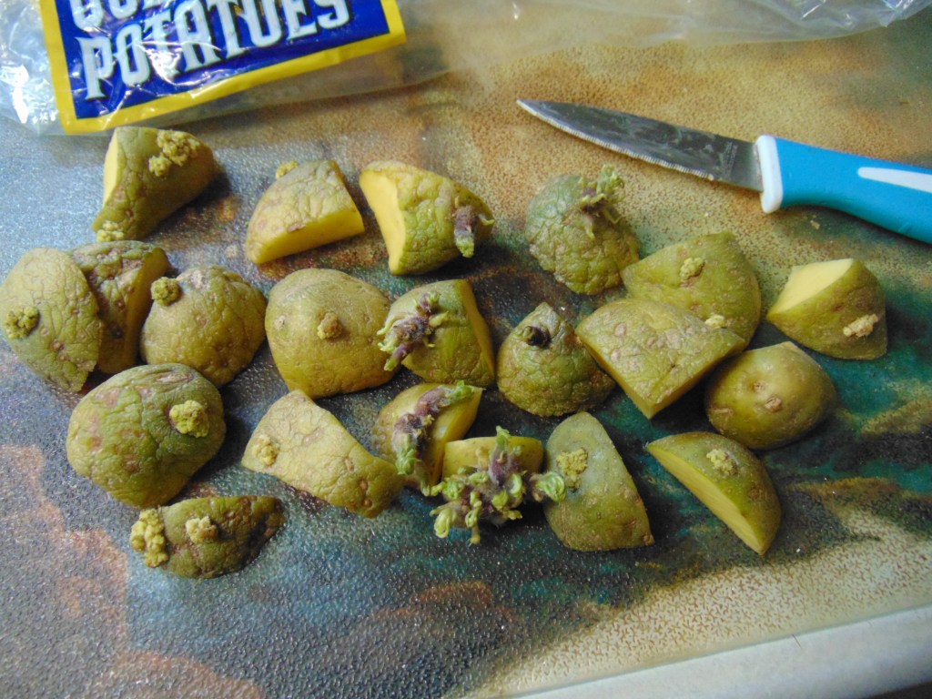 Just take each potato and cut into chunks with at least one sprout, then plant in a sunny area with well-drained, amended soil. They do best in full sun, but I have some growing in shade that are doing well. They should be planted fairly deep because any part of the potato that is not under the soil will turn green. I water them when the soil dries out slightly. Here is a photo of my cut up potatoes that I planted.