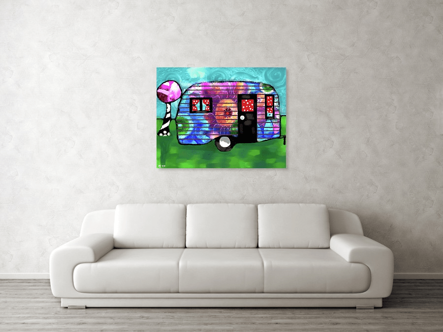 I love all the fixed up vintage camp trailers so that was the inspiration for this piece. I created it in Krita, the art program that I use, with a mouse, layers, a variety of brushes, strokes, colors and opacities.