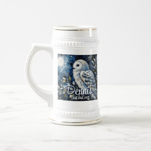 My dad loves owls and he also loves beer steins. On Zazzle, I personalized my white owl art with my dad’s name and ‘best dad ever’ and put the image on a beer stein. This is what it looks like.
